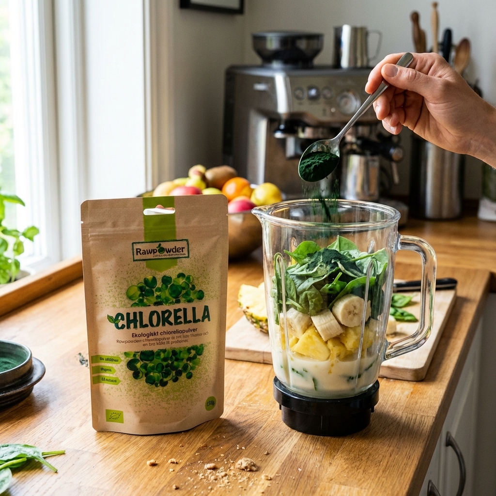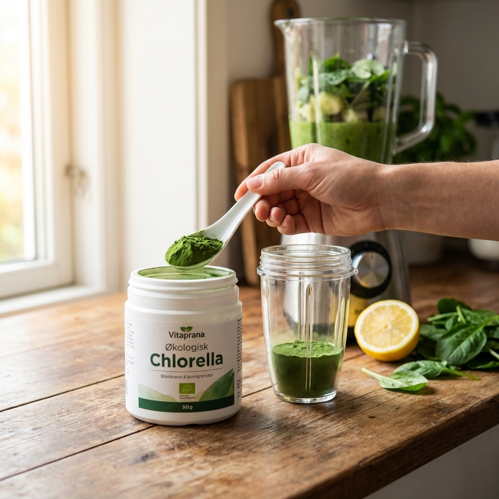 En af de klare styrker er alsidigheden: pulveret kan bruges i juice, smoothies, sunde shots og bagværk, og det gør det lettere at få det ind som fast rutine. Næringsmæssigt er 65 g protein pr. 100 g værd at hæfte sig ved, og pr. portion er der oplyst 2 g protein samt 9 kcal, så det er et let supplement at bygge oven på en i forvejen varieret kost. Samtidig er det værd at være realistisk omkring smag og tilvænning: chlorella har en markant grøn og let jordet profil, så mange vil få den bedste oplevelse ved at blande den i smoothie eller juice fremfor vand alene. Hvis du i forvejen ser på andre grønne tilskud som spirulina eller ønsker at kombinere med en bredere basisløsning som multivitamin, giver det mening at tænke i helhed frem for at forvente, at ét pulver skal klare alt alene.
