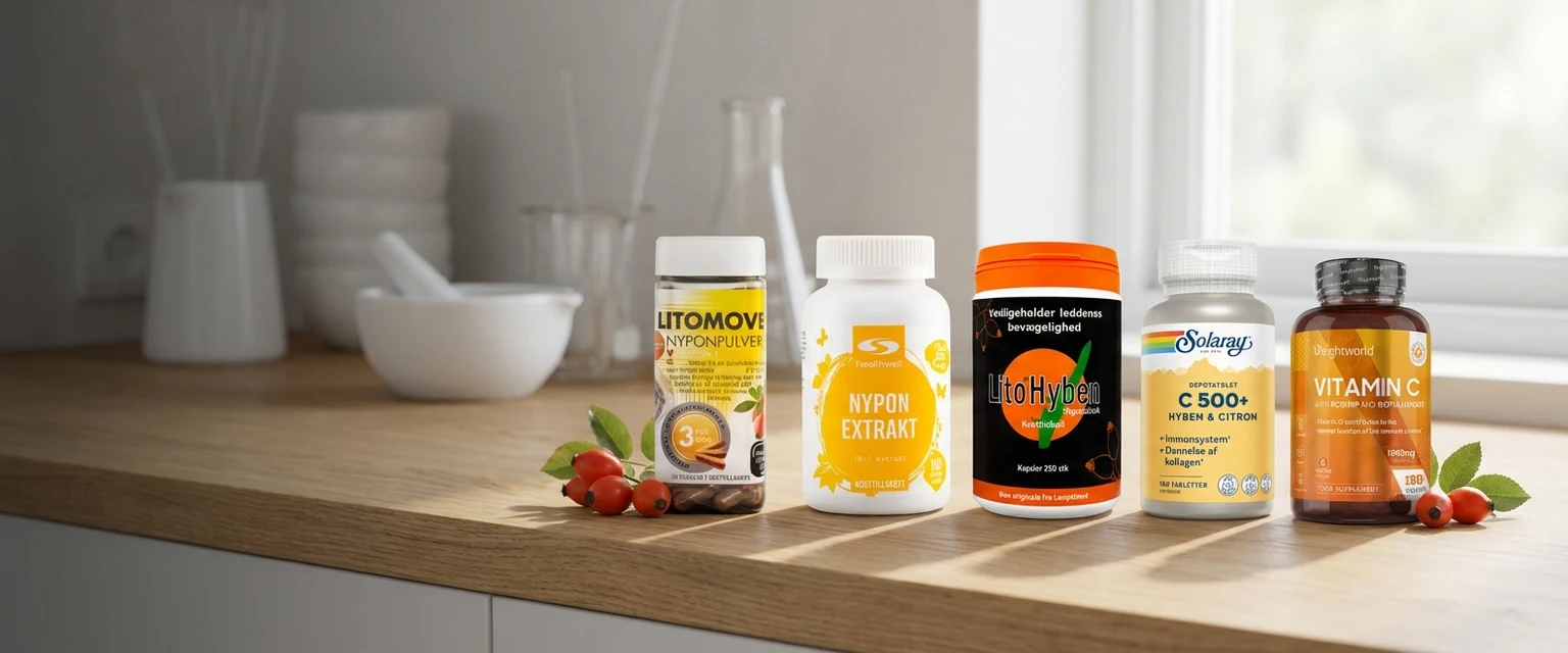 Vi har vurderet 5 produkter i kategorien hyben-kapsler ud fra ingredienser, dosering, pris pr. dagsdosis og overordnet brugervenlighed.